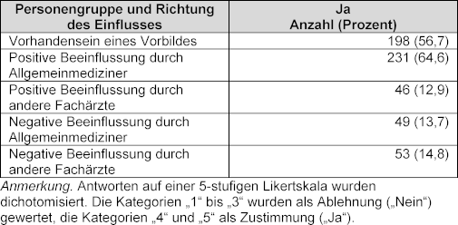 Allerdings hängt die Güte der Lehrveranstaltungen vom Lehrenden selbst ab. Die gute Betreuung durch den Lehrarzt ist mit einer hohen Sicherheit, die Allgemeinmedizin als Facharztrichtung zu wählen, verbunden [24]. Vorbilder stellen generell einen wichtigen beeinflussenden Faktor für die Facharztwahl dar [25], [26]. In qualitativen Studien wurden mehrfach allgemeinmedizinische Vorbilder als wichtiger Einflussfaktor benannt [27], [28], [29], quantitativ erhoben wurde dieser Faktor bisher jedoch nur in zwei deutschen Studien [12], [17]. Mehr als die Hälfte unserer Studienteilnehmer geben an, ein Vorbild unter den (Lehr-)Ärzten der Allgemeinmedizin gefunden zu haben oder durch Ärzte aus der Allgemeinmedizin positiv in ihrer Einstellung zur Allgemeinmedizin beeinflusst worden zu sein. Die Zustimmung zu dieser Aussage zeigt darüber hinaus einen signifikanten Zusammenhang mit einem Interesse an der hausärztlichen Tätigkeit. Hierdurch kann ein positiver Einfluss von Ärzten aus der Allgemeinmedizin auf die Facharztwahl abgeleitet werden.