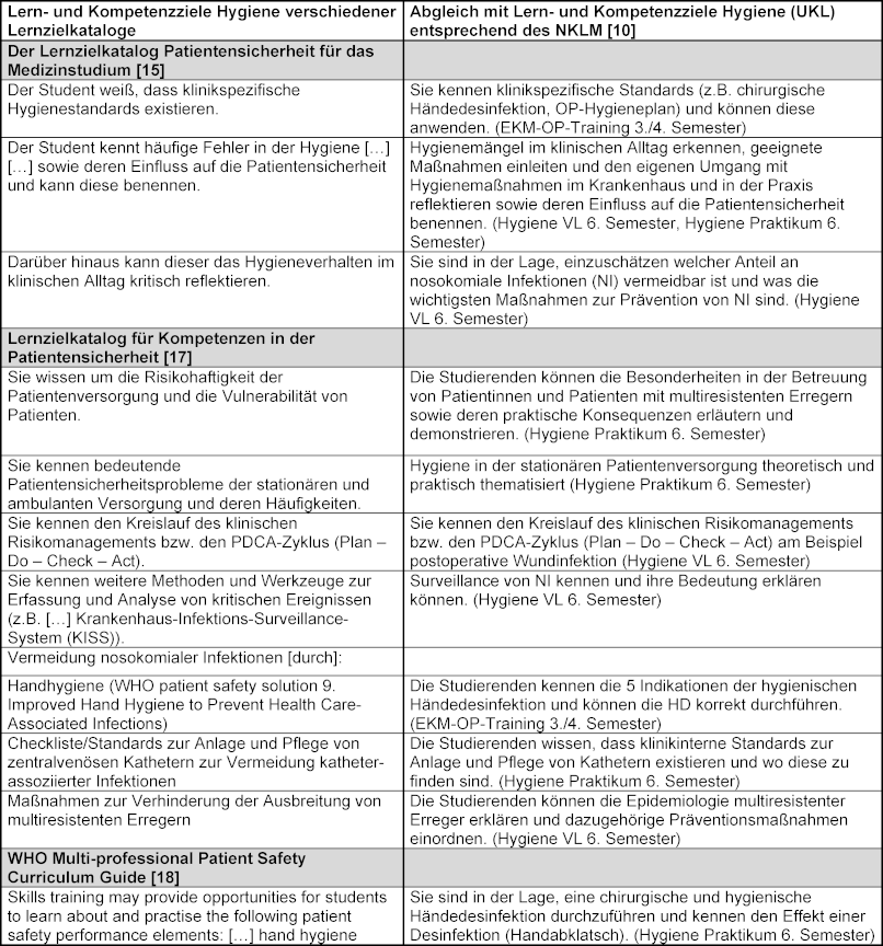 Im Rahmen der Einführung des Lehrprojektes „OP-Training – Pannenfrei in den OP“ und der didaktischen Umstrukturierung der Vorlesung sowie der Praktika „Hygiene“ sind im Lehreteam des Instituts für Hygiene, Krankenhaushygiene und Umweltmedizin umfassende Ausarbeitungen zu den aktuell geltenden Lernzielkatalogen erfolgt. Dabei erfolgte die Orientierung an den Lern- und Kompetenzzielen für den Bereich der Hygiene des NKLM [10]. Unter der Maßgabe, dass die (Hände-)Hygiene im hygienischen Grundverständnis per se unabdingbar für die Patientensicherheit ist, wurden die übernommenen Lern- und Kompetenzziele ebenfalls mit den Lernzielkatalogen zur Patientensicherheit abgeglichen (siehe Tabelle 1 [Tab. 1], http://www.nklm.de], [13], [14], [15]). Im Rahmen der folgenden Lehrbeschreibungen wird die Tabelle 1 [Tab. 1] und die entsprechende Gegenüberstellung der Lernziele verschiedener Lernzielkataloge herangezogen.