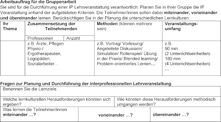 Schlussfolgerung: Die subjektiven Rückmeldungen der Teilnehmenden zur Zufriedenheit und zum Erkenntnisgewinn lassen auf eine Akzeptanz des Workshopkonzeptes schließen. Durch die gemeinsame Planung einer IP Lehrveranstaltung werden Besonderheiten verdeutlicht, die sich aus heterogenen Lernkulturen ergeben. Diese Besonderheiten gilt es beim IP Lehren zu nutzen, um die Lernenden besser auf die IP Zusammenarbeit in der Praxis vorbereiten zu können.