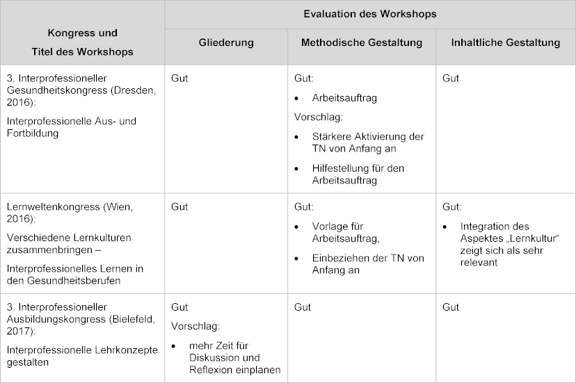 Der Workshop wurde im Zeitraum April 2016 bis März 2017 im Rahmen von drei verschiedenen deutschsprachigen Kongressen jeweils einmal durchgeführt („Do“). Mindestens zwei Mitglieder der Arbeitsgruppe leiteten die Workshops als Referentinnen. Der Titel und der zeitliche Umfang wurden jedes Mal an die Rahmenbedingungen der Kongressveranstalter angepasst. Es nahmen jeweils zwischen elf und 25 Personen aus mindestens drei verschiedenen Professionen an den Workshops teil, hauptsächlich Lehrende in den Gesundheitsberufen, wie zum Beispiel der Humanmedizin, Pflege, Logopädie, Physio- und Ergotherapie. Nach den Workshops reflektierten die Teilnehmenden in einer offenen Feedbackrunde anhand von drei Leitfragen: