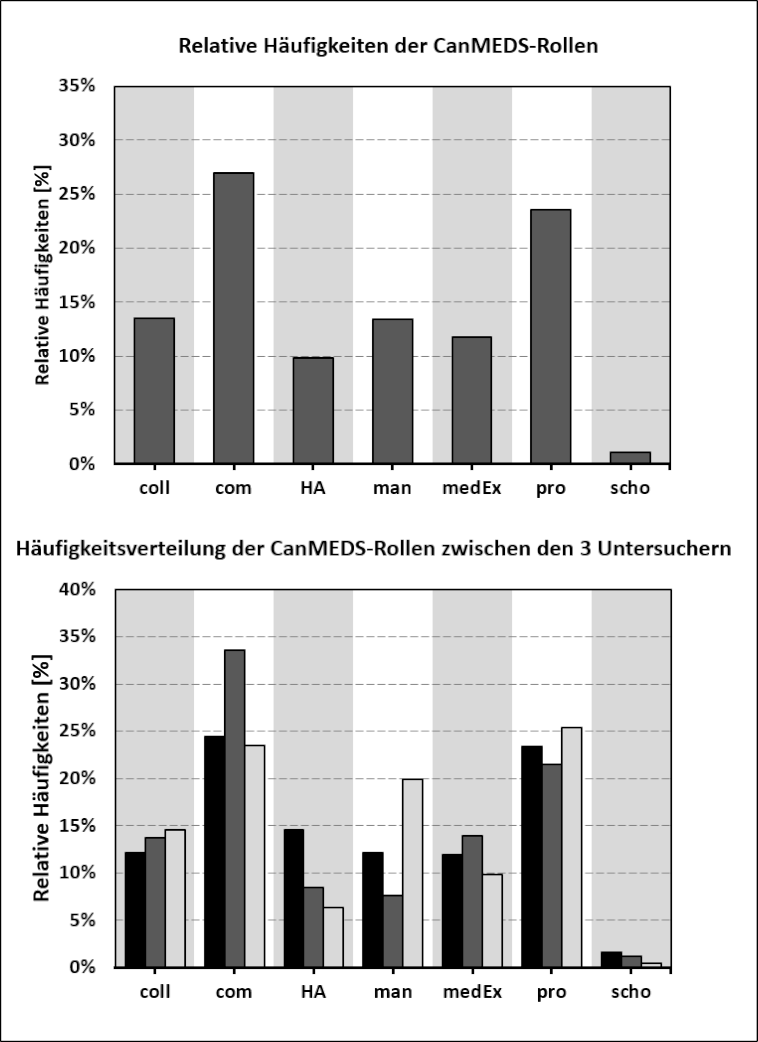 Zur Analyse der Häufigkeit der einzelnen CanMEDS-Rollen erfolgte eine Gewichtung in der Reihenfolge, die der jeweilige Untersucher festgelegt hatte nach dem Verhältnis 3:2:1 (erste gewählte Rollen gegenüber der zweiten und dritten). Um eine artifizielle Vergrösserung der Stichprobe zu verhindern, wurden die erstgenannten Rollen mit 3/6, die zweitgenannten mit 2/6 und die drittgenannten mit 1/6 multipliziert. Daraus errechneten wir die relativen Häufigkeiten der CanMEDS-Rollen. Des Weiteren überprüften wir, ob besonders häufige Kombinationen von CanMEDS-Rollen gefunden wurden.