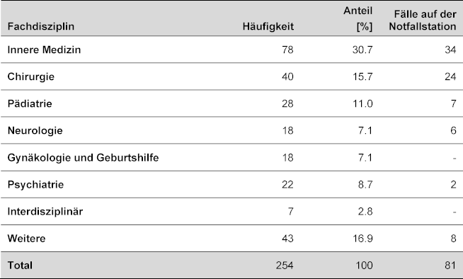 Am häufigsten wurden Fälle aus der Inneren Medizin (31.0%) eingereicht, gefolgt von Chirurgie (15.9%) und Pädiatrie (11.1%). Unabhängig von der Fachdisziplin traten 31.9% der Fälle bei notfallmedizinischen Behandlungen auf. Innerhalb der chirurgischen Fallbeispiele machten diese 60% aus (24/40). Eine genaue Auflistung findet sich in Tabelle 1 [Tab. 1].