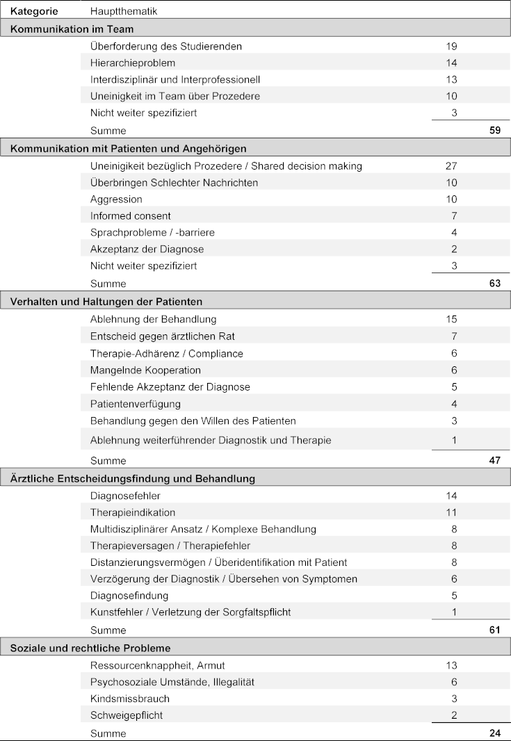 Die Fallbeispiele zeigten ein grosses Spektrum an zugrundeliegender Thematik (siehe Tabelle 2 [Tab. 2]). Den Thematiken wurden 29 übergeordnete Gruppen zugeordnet, welche wiederum in fünf Kategorien aggregiert wurden: „Kommunikation im Team“, „Kommunikation mit Patienten und Angehörigen“, „Verhalten und Haltungen der Patienten“, „ärztliche Entscheidungsfindung“ und „Soziale und rechtliche Probleme“.