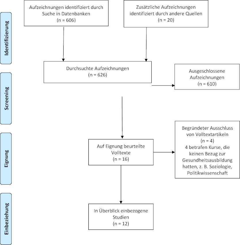 Anhang 1 [Anh. 1] fasst die wesentlichen Merkmale der Studien dieses Überblicks zusammen, einschließlich Ziele der Studie, Merkmale der Lernenden, Einzelheiten zur Pädagogik, verwendete Maßstäbe sowie signifikante Ergebnisse und Verzerrungsrisiken. Der PRISMA-Ablaufplan für diesen Überblick wird in Abbildung 1 [Abb. 1] gezeigt. Insgesamt wurden 16 Berichte unter Verwendung unserer Suchkriterien identifiziert. Vier Referenzen wurden entfernt, da sie keine Gesundheitsberufe umfassten, so dass 12 Studien in diesen Überblick einbezogen wurden.