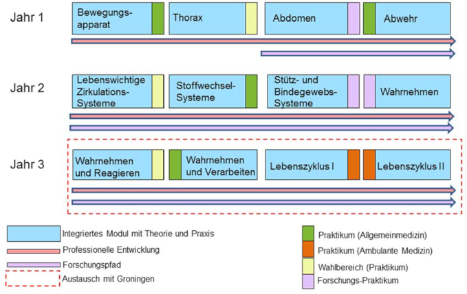 Das Bachelor-Master-Konzept ist im Curriculum ebenfalls nach wie vor noch in einer klaren Trennung in einen ersten und zweiten Studienabschnitt abgebildet, die beide je drei Jahre umfassen. Das Groninger Curriculum [9] spiegelt sich ebenfalls in der curricularen Gestaltung wider, u.a. darin, dass das Studienjahr – wie auch in Groningen – 40 Wochen lang ist.
