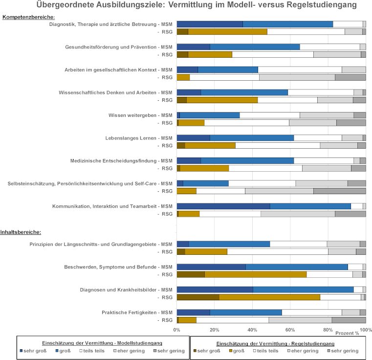 Um das Erreichen der definierten übergeordneten Ausbildungsziele und einen möglichen Fortschritt durch den MSM besser einschätzen zu können, wurden die Ergebnisse bezüglich der Relevanz und Vermittlung der übergeordneten Ausbildungsziele mit den Ergebnissen der Studienausgangsbefragung zwischen Regel- und MSM-Studierenden im Praktischen Jahr verglichen.