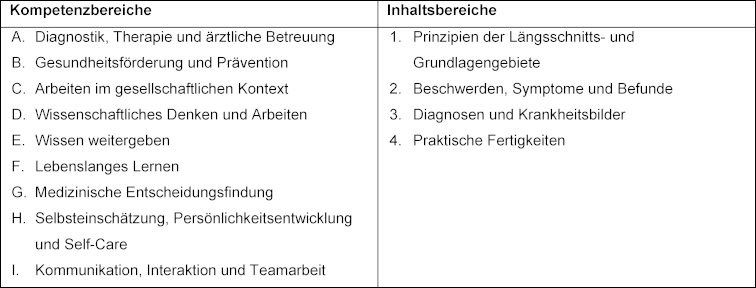 Tabelle 1: Übersicht über die Kompetenz- und Inhaltsbereiche der Ausbildungsziele, die als Rahmenwerk für die outcome-orientierte Curriculumsplanung des Modellstudiengangs Medizin dienten.