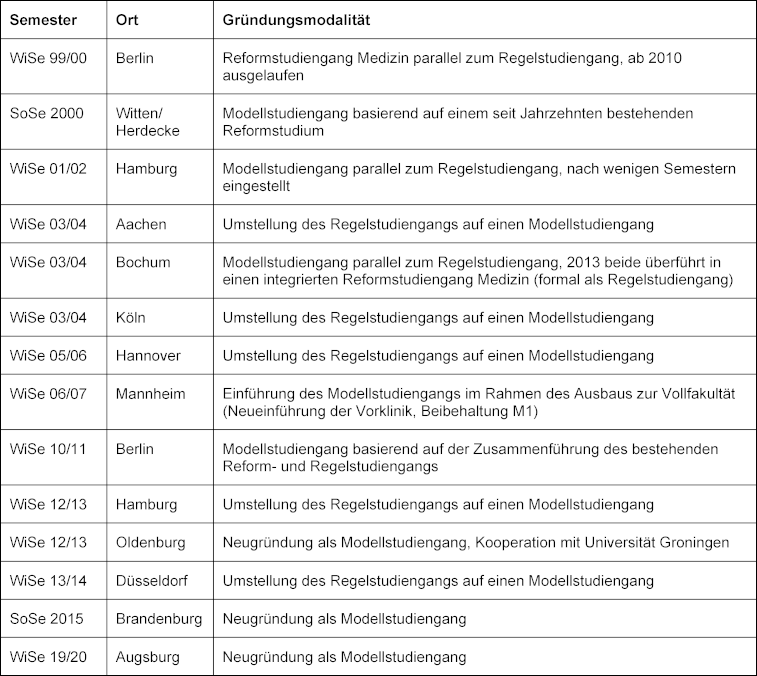 Auch in Bochum und Hamburg bestanden zunächst ein Regel- und Reformstudiengang nebeneinander. In Bochum wurden beide Studiengänge zu einem integrierten Reformstudiengang im Sinne eines reformierten Regelstudiengangs zusammengeführt. Der erste Modellstudiengang in Hamburg von 2001 endete mit der Begründung „Die Fakultät könne weder dem Modellstudiengang noch dem Regelstudium gerecht werden. Denn nach Einführung der neuen ÄAppO gab es plötzlich drei verschiedene Curricula: die alte und neue ÄAppO sowie den Modellstudiengang.“ [42]. Anders gesagt: die drei Modellstudiengänge, die parallel zu Regelstudiengängen entstanden waren, existieren heute nicht mehr in ihrer Ursprungsform.