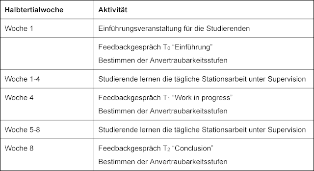 Aufgrund dessen ist es sinnvoll bereits während des Praktischen Jahres den Medizinstudierenden zunehmend mehr Verantwortung zu übertragen [1]. Ein schrittweises Anvertrauen von professionellen ärztlichen Tätigkeiten an Medizinstudierende oder Ärztinnen in Weiterbildung wird aktuell stark diskutiert und bereits in einigen Ländern in der medizinischen Aus- und Weiterbildung mit dem Konzept der anvertraubaren professionellen Tätigkeiten (APT) implementiert (Niederlande: [2]; USA: [3]; Schweiz: [4]). Eingeführt zu Beginn dieses Jahrhunderts werden die APTs als Einheiten professioneller Praxis definiert, die einer Aus- oder Weiterzubildenden anvertraut werden können [5]. Die Anvertraubarkeitsstufen reichen von der direkte Supervision bis zum vollständigen Anvertrauen der Tätigkeit ohne Supervision, sobald die Aus- oder Weiterzubildende die notwendigen Kompetenzen zum Erfüllen der entsprechenden Aufgabe ohne Supervision zeigt [5], [6]. Unabhängig von dem Umfang der APTs hat ten Cate fünf Stufen des Anvertrauens definiert: