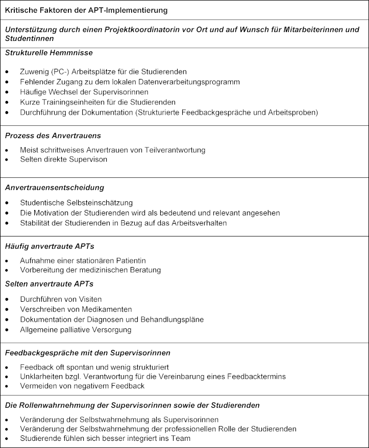 Für die Einführung des APT-Curriculums auf den Stationen boten die Projektkoordinatorinnen ihre Unterstützung bis zu vier Stunden pro Woche und pro Station bzw. Praxis an. Diese Unterstützung beinhaltete das Training der Supervisorinnen sowie der Medizinstudierenden als auch die Unterstützung im täglichen Stationsablauf. Das Ziel der angebotenen Unterstützung war es, das Projekt immer wieder in das Bewusstsein der Beteiligten zu rufen, Vorschläge für mehr Autonomie der Medizinstudierenden zu unterbreiten und die Reflexion für das PJ-Stationstraining durch gezielte Fragetechniken zu fördern. Mit dieser intensiven Unterstützung sollte ein Zurückfallen in gewohnte Verhaltensmuster während der Implementation reduziert werden. Medizinstudierende und Supervisorinnen betonten die Notwendigkeit und Nützlichkeit dieser zentralen Unterstützung. Der Aufwand der Koordinatorinnen für die Implementation des APT-Curriculums auf den Stationen lag bei etwa einer Stunde pro Woche für die Medizinstudierenden und ihre supervidierenden Ärztinnen.