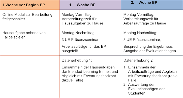 Die Studenten nehmen jeweils am Montag der beiden Blockpraktikumswochen an einem Seminar von jeweils 3 UE im Konferenzraum des Instituts für Hausarztmedizin teil. Ziel des Seminars ist die Vertiefung der erlernten Inhalte des Online-Lernmoduls sowie die Besprechung der mitgebrachten Hausaufgaben. Die Seminare wurden von einer Fachärztin für Allgemeinmedizin und wissenschaftlichen Mitarbeiterin des Instituts für Hausarztmedizin (BE) sowie der Doktorandin (ME) geleitet.