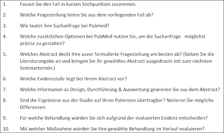 - Lernziele: Die Studenten sollten eine ausreichende Basisausbildung auf dem Gebiet der EbM erhalten, sodass sie das Konzept der evidenzbasierten Medizin verstehen. Insbesondere sollte hier das Wissensmanagement geschult werden.