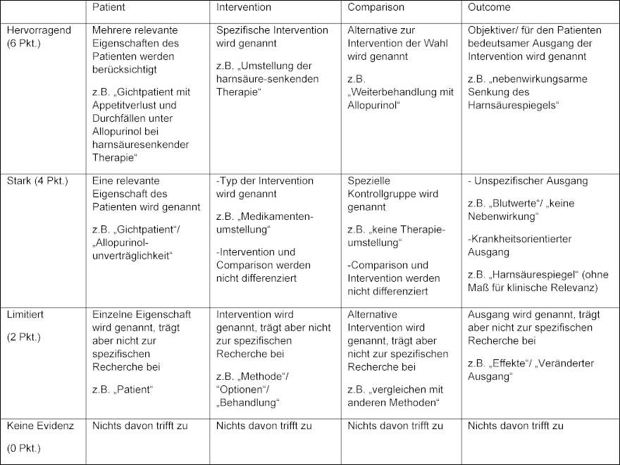 Ebenso wird das PICO Schema eingeführt und erläutert. Das PICO Schema dient der Entwicklung wissenschaftlicher Fragestellungen [8]. Die Buchstaben P, I, C und O stehen jeweils für die wichtigsten Aspekte, die bei der Frage nach der bestmöglichen Therapie berücksichtigt werden sollten (P=„Patient Problem“, I=„Intervention“, C=„Comparison“, O=„Outcome“).
