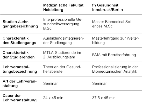 In zwei ausgewählten Bildungsszenarien an unterschiedlichen Standorten und Studiengängen (siehe Tabelle 1 [Tab. 1]) wird das Modell des CR nach Higgs & Jones mit den Studierenden bearbeitet, wobei in den entsprechenden Seminaren im Speziellen auf das Scientific, Konditionale, Interaktive, Narrative, Pragmatische und Ethische Reasoning eingegangen wird. Ziel der jeweiligen Seminare ist, durch die theoretische Reflexion praktischer Handlungen das eigene Handeln kritisch zu hinterfragen und die Entwicklung professioneller Handlungsmuster zu fördern.