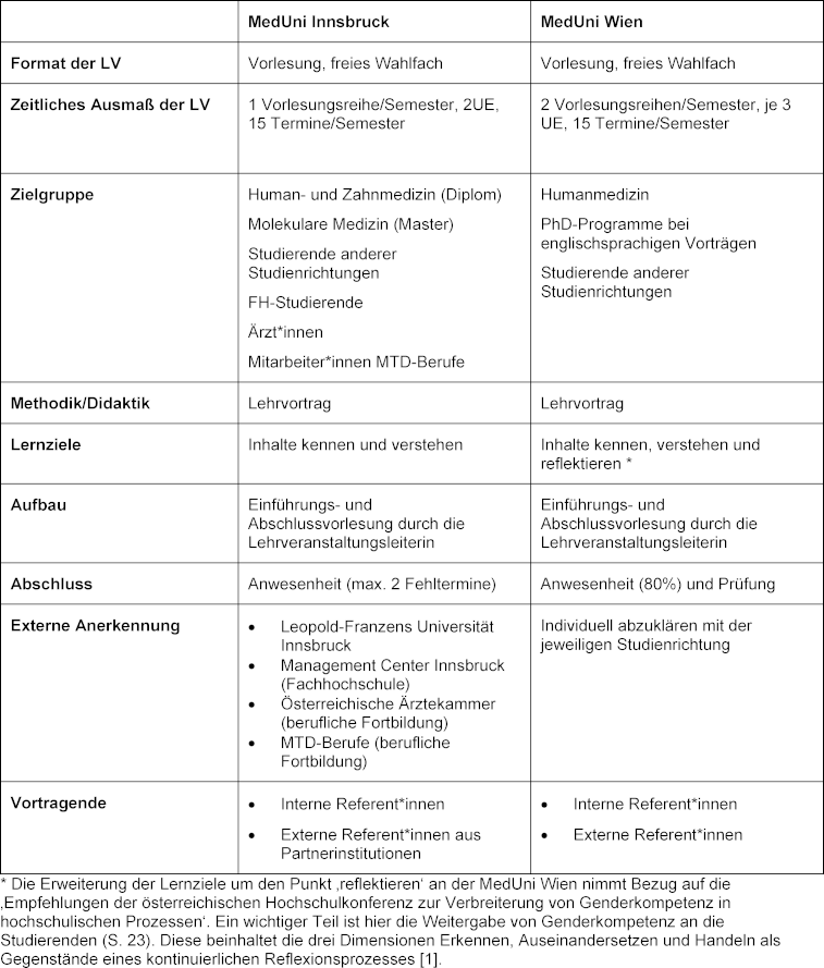 Ergebnisse: Die Grundpfeiler der Lehrveranstaltung (semesterweise wechselnde Themen, verschiedene Vortragende zu einem vorab definierten, quer zu den Disziplinen liegenden Thema) sind ähnlich. Sowohl bei Zielgruppen und Vortragenden als auch bei der Frage der Anrechnung für Externe gibt es verschiedene Zugänge. Inhaltlich bearbeiten beide semesterweise wechselnde medizinische Fachgebiete mit dem Schwerpunkt auf geschlechtsspezifischen Fragestellungen.