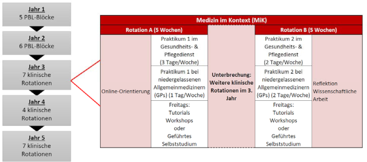 Das Aushängeschild der Diversity-Lernkomponente an der WSUSoM ist das so genannte „Medizin im Kontext“-Programm (oder kurz „MiK“), das im ersten klinischen Jahr (3. Jahr) im Rahmen von zwei 5wöchigen Rotationen gelehrt wird. Die Studenten machen vier Tage pro Woche ein Praktikum bei einem Gesundheits- & Pflegedienst und bei niedergelassenen Allgemeinmedizinern (GPs) und nehmen Freitag dann am Campus an Tutorials und Workshops teil, um ihre Lernerfahrungen aus der Praxis nachzubereiten und zu konsolidieren (siehe Abbildung 1 [Abb. 1]).
