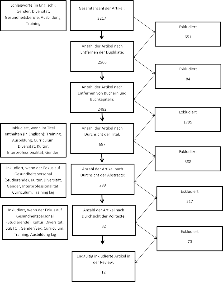 Die Artikelauswahl beinhaltete auch die Überprüfung aller Artikel auf der Grundlage ihres Titels, so wurden nur die Artikel mit einbezogen, die sich mit Training oder Ausbildung befassten und diese oder ähnliche Begriffe im Titel verwendeten. Darüber hinaus mussten die Artikel in ihrem Titel auf Diversität, Kultur, Geschlecht, LGBTQI oder andere soziale Kategorien der Diversität verweisen. Artikel wurden ausgeschlossen, wenn sie dies nicht taten. Ein nächster Schritt bestand darin, Abstracts heranzuziehen und so die Anzahl der Artikel einzugrenzen. Es wurden nur die Artikel einbezogen, die im Abstract auf Training oder Ausbildung zu Diversitätsaspekte wie Geschlecht, soziale Klasse, Behinderung, Sexualität, Alter, Kultur, Ethnizität im Sinne der EU-Antidiskriminierungsrichtlinie [15] verwiesen. Schließlich wurden Volltexte herangezogen, um die Artikelauswahl zu finalisieren. Hier wurden alle Artikel exkludiert, die sich mit anderen Aspekten als der Ausbildung von Studierenden oder Angehörigen der Gesundheitsberufe zu Diversität befassten, sich mit anderen Berufsgruppen als Gesundheitsberufe, und sich nicht auf Trainings oder Ausbildung, sondern sich auf ein Auslandsstudium bezogen. Dies bedeutet auch, dass Artikel ausgeschlossen wurden, wenn sie sich auf die zunehmende Diversität der Angehörigen der Gesundheitsberufe und die beschriebenen Programme konzentrierten; sich nur auf die interprofessionelle Zusammenarbeit konzentrierten; sich auf die Ausbildung oder das Studium verschiedener Bevölkerungsgruppen, aber nicht auf Angehörige der Gesundheitsberufe konzentrierten; sich auf die berufliche Identität, das Einfühlungsvermögen oder den Kommunikationsstil konzentrierten; keine Informationen über die durchgeführte Ausbildung lieferten; oder allgemeine Empfehlungen zur Einbeziehung von Diversitätsaspekten abgaben, ohne sich ausdrücklich auf den Inhalt oder die Art der Durchführung zu konzentrieren, oder nicht abrufbar waren. Letztendlich wurden 12 Artikel in diesen Scoping Review aufgenommen. Die Schritte zur Auswahl der Artikel sind in Abbildung 1 [Abb. 1] dargestellt.