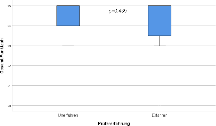 In der Beurteilung der Prüflinge mit exzellenter Leistung zeigte sich kein wesentlicher Unterschied zwischen erfahrenen und unerfahrenen Prüfern/innen (siehe Tabelle 3 [Tab. 3], siehe Abbildung 4 [Abb. 4]). Im Gegensatz dazu bestand ein signifikanter Unterschied in der Beurteilung der Borderline-Prüflinge zwischen den Prüfergruppen (siehe Tabelle 3 [Tab. 3], siehe Abbildung 5 [Abb. 5]). Unerfahrene Prüfer und Prüferinnen neigten dazu, die erbrachte Leistung schlechter einzuschätzen als erfahrene Prüfer/innen.