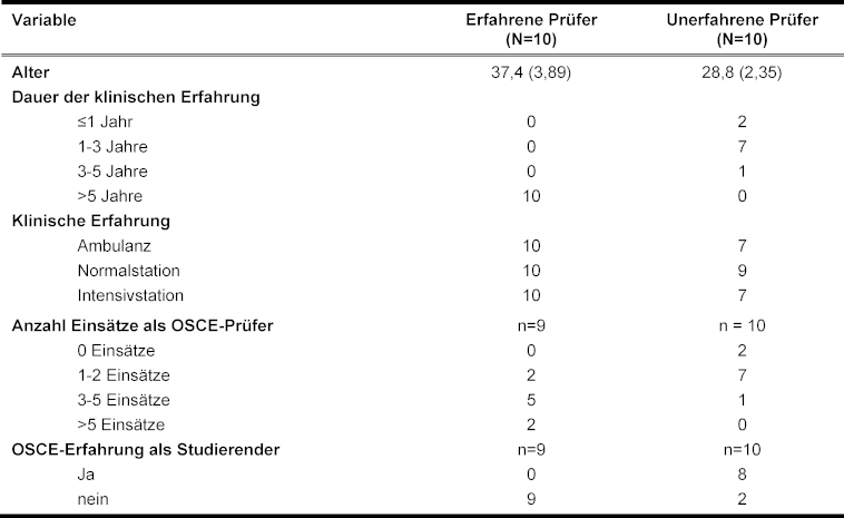 Zehn erfahrene und 10 unerfahrene Prüfer und Prüferinnen wurden in die Studie eingeschlossen, davon 1 weiblicher und 9 männliche Prüfer in der Gruppe der erfahrenen und 3 weibliche sowie 7 männliche Prüfer in der Gruppe der unerfahrenen Prüfer. Alle Prüfer/innen beurteilten alle Standardisierten Prüflinge in einer Prüfungssituation aus dem OSCE des 1. Studienteils. Details zum Erfahrungsgrad der Prüfer/innen sind in Tabelle 2 [Tab. 2] angegeben.
