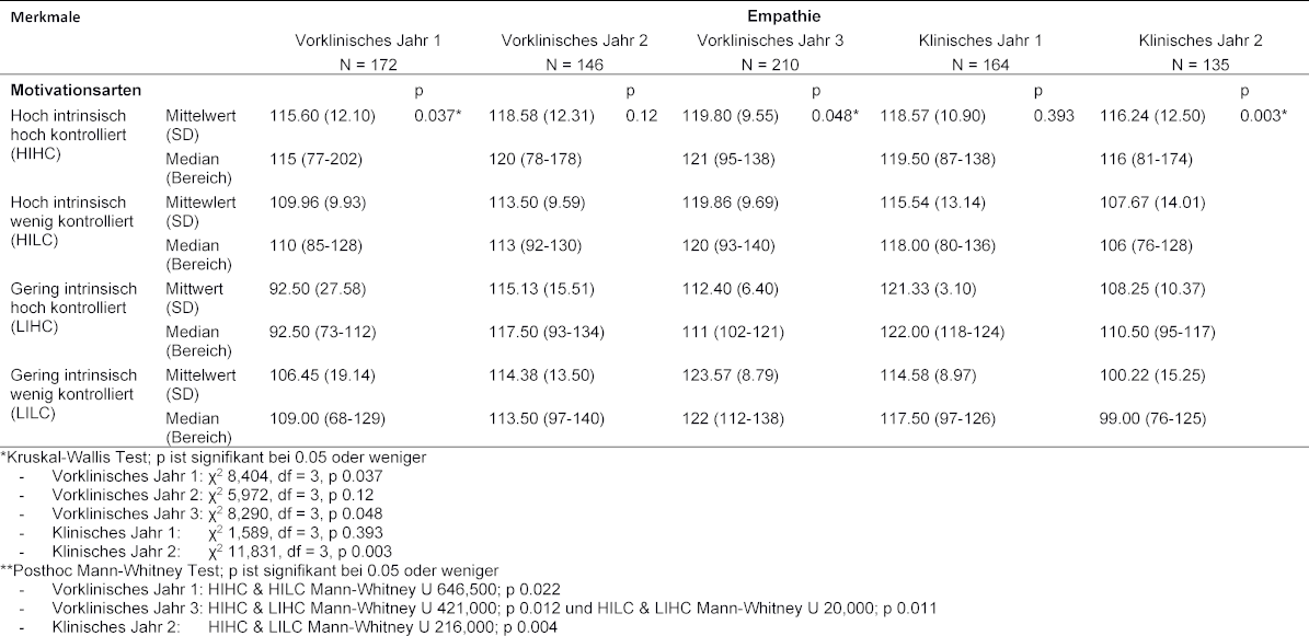 Tabelle 2 [Tab. 2] gibt die Empathiewerte basierend auf den vier unterschiedlichen Motivationsarten wieder. Die Ergebnisse des Kruskal-Wallis Tests zeigen, dass statistisch signifikante Unterschiede zwischen den unterschiedlichen Motivationsarten zugeordneten Empathiewerten bei Studenten des ersten und dritten vorklinischen Jahres (Jahre 1 und 3) sowie Studenten des zweiten klinischen Jahres (Jahr 5) bestanden. Der Mann-Whitney Test ergab statistisch signifikante Unterschiede zwischen den Empathiewerten zwischen den Motivationsarten HIHC und HILC bei Studenten im ersten vorklinischen Jahr (Jahr 1) (Mann-Whitney U 646,500; p=0,022); HIHC/HILC und LIHC (Mann-Whitney U 421,000; p=0,012 bzw. Mann-Whitney U 20,000; p=0,011), sowie LIHC und LILC bei Studenten im dritten vorklinischen Jahr (Jahr 3) (Mann-Whitney U 3,500; p=0,008); und HIHC und LILC bei Studenten im zweiten klinischen Jahr (Jahr 5) (Mann-Whitney U 216,000; p=0,004).
