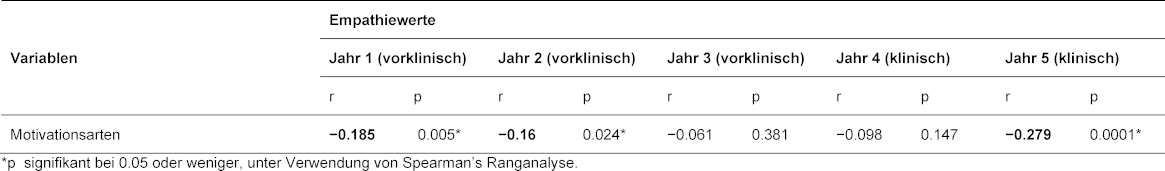 Darüber hinaus wurde eine Spearman Rangkorrelationsanalyse durchgeführt, um die Beziehung zwischen Empathie und Motivationsart der Studierenden zu bestimmen. Alle Analysen wurden für jedes Studienjahrkohorte durchgeführt, wobei die Unterschiede in der Lernerfahrung und im Lehrplan zwischen den Jahren berücksichtigt wurden.