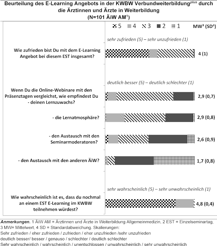 Vom 23.04.2020 bis 09.05.2020 wurden fünf Seminartage vollständig online durchgeführt (Angebot für 125 ÄiW). Es nahmen 104 ÄiW teil. Es beteiligten sich 101 ÄiW (Rücklauf 97,1%) sowie alle Doz (N=11), die nicht Mitarbeitende des KWBW waren. Die Soziodemographie zeigt Tabelle 1 [Tab. 1]. 28,7% (N=29) der ÄiW und 45% (N=5) der Doz hatten bereits Erfahrung mit E-Learning. 52% (N=53) der ÄiW und 55% (N=6) der Doz haben ihre Einstellung gegenüber E-Learning geändert (alle Angaben im Freitext waren positive Einstellungsänderungen) Die Ergebnisse der Evaluation aus Sicht der ÄiW zeigt Abbildung 1 [Abb. 1]. Neun Doz (82%) waren mit der Idee des E-Learning zufrieden bis sehr zufrieden, alle würden sich erneut bei diesem Format engagieren. 55% (N=6) beurteilten den Lernzuwachs für die ÄiW als schlechter, 45% (N=5) hielten ihn für vergleichbar gegenüber klassischen Lehrformaten. Alle Doz empfanden den Austausch mit den ÄiW als schlechter (N=7) oder deutlich schlechter (N=4). Vor- und Nachteile von E-Learning aus Sicht von ÄiW und Doz sind in Tabelle 2 [Tab. 2] und Tabelle 3 [Tab. 3] dargestellt.