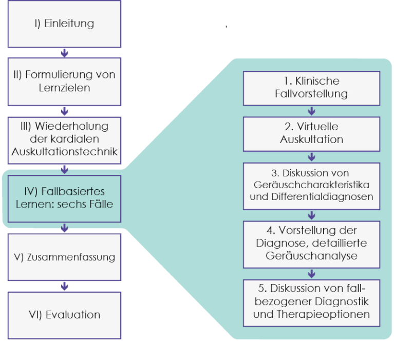 Ein virtueller Auskultationskurs mit klinischen Fällen und Audio-Auskultationsbeispielen wurde eingeführt, um den Mangel an praktischer Ausbildung vor Ort zu kompensieren. Das Format der Videokonferenz als synchrones Kommunikationsformat wurde gewählt, da es dem interaktiven Charakter des Präsenzunterrichts am ehesten entspricht.