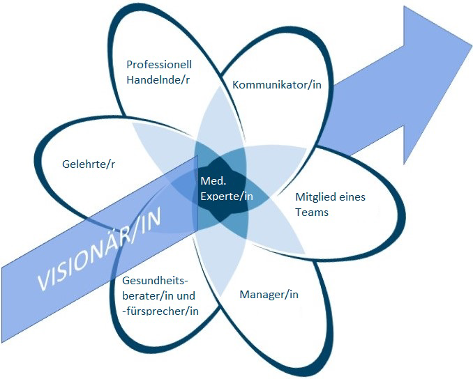 Um das ärztliche Rollenbild zu definieren und für die ärztliche Ausbildung nutzbar zu machen, wurden in der Vergangenheit verschiedene Ansätze verfolgt und versucht, sie für die ärztliche Ausbildung nutzbar zu machen. Ein bisher weit verbreitetes Modell hierfür stellen die CanMEDS-Rollen dar [19]. Sie wurden für die Erstellung des NKLM 2015 auf den deutschsprachigen Raum angepasst und mit kompetenzorientierter Lehre verbunden [http://www.nklm.de]. In den vergangenen Jahren ist – insbesondere im Zuge der Digitalisierung – aufgefallen, dass sich innerhalb der bestehenden Rollendefinitionen nur schwer innovative, system-transzendente Ideen oder gar Lernziele abbilden lassen.