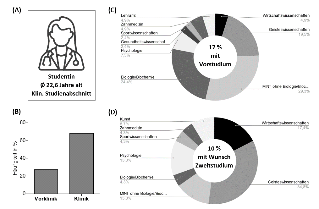 Abbildung 3: Demografie. (A) Die durchschnittliche Studienteilnehmerin ist weiblich, 22,6 Jahre alt und im klinischen Studiensemester. (B) Zugehörigkeit der Befragten zum Studienabschnitt. Darstellung: relative Häufigkeiten, N=263; im Freisemester: 2, im Praktischen Jahr: 1, nicht angegeben: 9. (C) Anteilige Verteilung von Studienfächern, die von den Befragten vor dem Medizinstudium belegt wurden. Darstellung: absolute und relative Häufigkeiten, N=41. (D) Fächerwünsche der Befragten für ein gewünschtes paralleles Zweitstudium. Darstellung: absolute und relative Häufigkeiten, N=23.