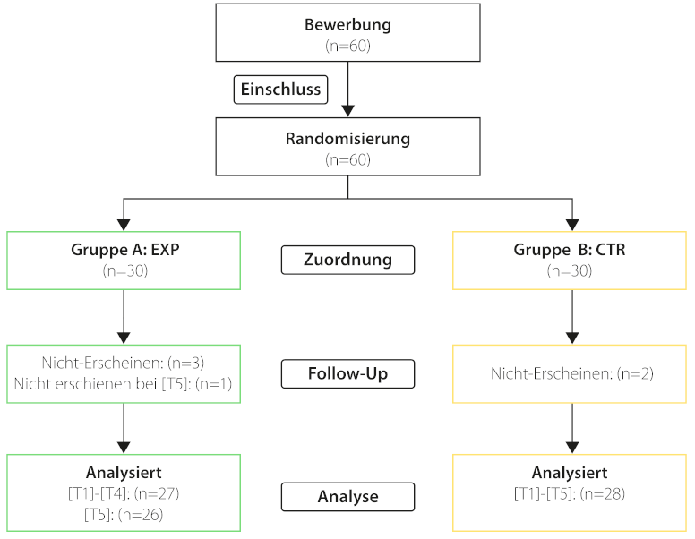 Abbildung 2: Randomisierung: N = 60 Medizinstudierende wurden rekrutiert und nach dem Zufallsprinzip mit Hilfe von Zufallszahlen, die mit dem Research Randomizer [https://www.randomizer.org] generiert wurden, zwei gleich großen Gruppen zugeordnet: Gruppe A (EXP) = Experimentalgruppe, B (CTR) = Kontrollgruppe. Aufgrund von Nicht-Erscheinen begann die Studie mit n=55 Teilnehmenden (A: n=27; B: n=28); eine teilnehmende Person der Gruppe A erschien nicht während des Follow-Up. Einschlusskriterien: Alter > 18 Jahre, Medizinstudierende im dritten Jahr an der Heinrich-Heine-Universität Düsseldorf, Internetzugang, Einverständniserklärung zur Teilnahme an der Studie. Ausschlusskriterien: Rücknahme der Einwilligung.