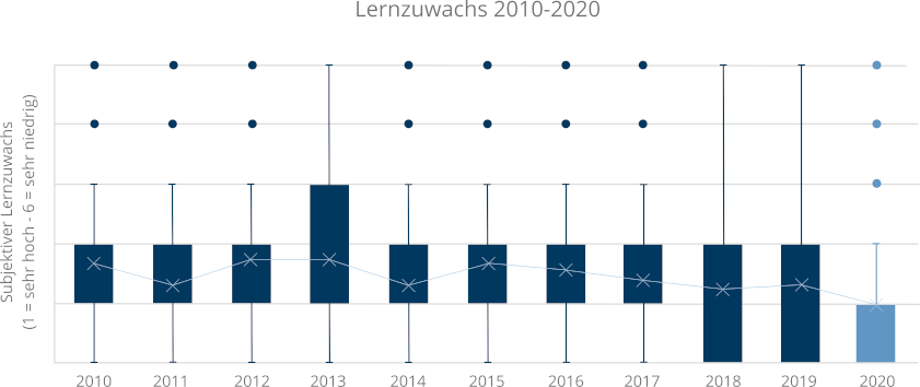 Abbildung 1: Vergleich des subjektiven Lernfortschritts der Studierenden in den Jahren 2010-2020 auf einer sechsstufigen Likert-Skala von 1=sehr hoch bis 6=sehr niedrig.