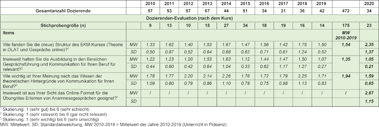 Im Rahmen des jeweils letzten Moduls bzw. nach Kursabschluss wurden die Dozierenden gebeten, den Kurs und die Relevanz der Ausbildung im Bereich der Gesprächsführung aus ihrer Sicht zu beurteilen. In den Präsenzjahren fand dies in Papierform statt, 2020 lief die Evaluation ebenfalls über einen LimeSurvey-Link per Mail.
