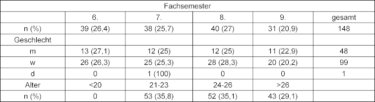 354 Studierende aus den klinischen Semestern der Zahnmedizin wurden zur Teilnahme an der Umfrage aufgefordert, wovon 155 den Fragebogen beantworteten. Aufgrund unvollständiger Fragebogendaten konnten lediglich 148 Studierende in die Auswertung einbezogen werden. Die Geschlechterverteilung der eingeschlossenen Teilnehmer entsprach der Gesamtverteilung der Studierenden von etwa 1/3 männlich und 2/3 weiblich. Die demografischen Daten sind in Tabelle 1 [Tab. 1] aufgeführt.
