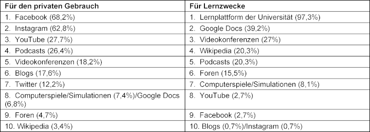 Die Top Ten der digitalen Medien, die aus privaten Gründen und im Zusammenhang mit dem Lernen genutzt wurden, sind in Tabelle 2 [Tab. 2] dargestellt. Sie zeigt, dass Facebook, Instagram und YouTube die überwiegend zu privaten Zwecken genutzten digitalen Medien waren. Podcasts wurden in mittlerem Maße als privat genutztes Medium angegeben. Zu Lernzwecken verwendeten die Studierenden hauptsächlich die Lernplattform ILIAS, die von der Universität bereitgestellt wird. Ein moderater Anteil der Studierenden nutzte das Kollaborationstool Google Docs und Wikipedia. Podcasts wurden von einem Fünftel der Teilnehmer favorisiert. Der Anteil der Teilnehmer, die Foren nutzen, war gering. Im Gegensatz zu ihren Spitzenpositionen bei der privaten Nutzung lagen Facebook, Instagram und YouTube auf den hinteren Plätzen der Top Ten der zu Lernzwecken genutzten digitalen Medien.