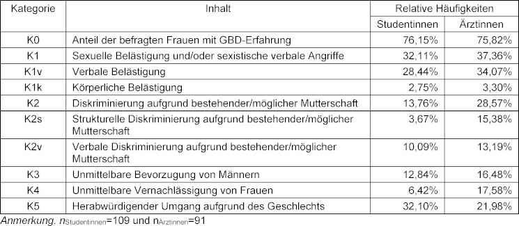 46,3% (n=109) der Studentinnen und 83,5% (n=91) der Ärztinnen beantworteten die Frage nach Erfahrungen mit GBD. Aus den Aussagen der Teilnehmerinnen wurden fünf Hauptkategorien gebildet. Die Kategorien 1 und 2 sind in zwei Subkategorien unterteilt. Strukturelle Diskriminierung ist in der Kategorie K2s im Sinne institutioneller Richtlinien und Prozeduren zu verstehen, die zu Ungleichheit zwischen Gruppen wie Menschen unterschiedlichen Geschlechts führen [35]. Die relativen Häufigkeiten der Nennungen sind in Tabelle 1 [Tab. 1] und Abbildung 1 [Abb. 1] aufgeführt. Für beispielhafte Antworten siehe Tabelle 2 [Tab. 2]. Zwischen Studentinnen und Ärztinnen zeigen sich deskriptiv Unterschiede: Studentinnen berichten GBD in Form von K5 häufiger als Ärztinnen, bei allen anderen Kategorien ist das Verhältnis umgekehrt.