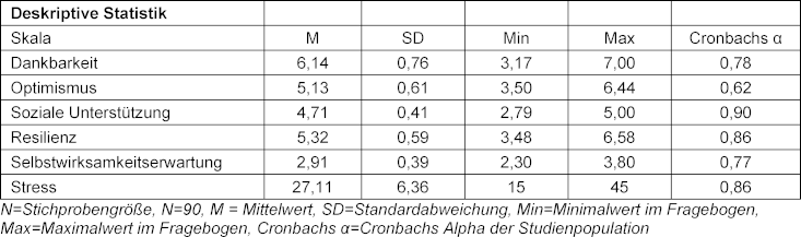In die Studie wurden 90 Medizinstudierende eingeschlossen; 30 von ihnen waren männlich (33,3%) und 60 weiblich (66,7%). Die deskriptive Statistik der einzelnen Skalen ist in Tabelle 1 [Tab. 1] dargestellt. Die internen Konsistenzen (Cronbachs α) waren jeweils hoch und lagen zwischen 0,78 und 0,90. Lediglich die Skala „Optimismus“ hat eine interne Konsistenz von α=0,62, was als vergleichsweise niedrig einzuschätzen ist.
