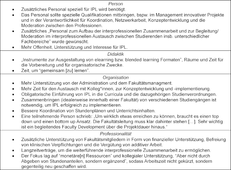 Auf die Frage nach Wünschen in Zusammenhang mit IPL wurden die Themen Personal- und Organisationsentwicklung in der Lehre (n=47 Kodierungen), Inhalte von IPL (n=5 Kodierungen) und Kooperationen (n=6 Kodierungen) von 30 Institutionen angesprochen. Die Wünsche in Bezug auf Personal- und Organisationsentwicklung in der Lehre sind in Tabelle 4 [Tab. 4] dargestellt. Die Teilnehmenden haben sich darüber hinaus Best-Practice-Beispiele und IPL-Konzepte gewünscht, die ihnen bei der inhaltlichen Entwicklung von Angeboten helfen könnten. Eine Erläuterung hierzu lautete: „Hauptproblem ist […] das Finden von Themen, die für beide beteiligten Berufsgruppen in ihrem jeweiligen Ausbildungsstand interessant sind.“ Die Wünsche in Bezug auf Kooperationen zwischen Fakultäten betrafen insbesondere finanzielle Ressourcen, das Engagement und die Bereitschaft der Fakultätsmitglieder. Eine Person forderte: „Andere Ausbildungsberufe/Studiengänge sollten […] idealerweise ähnliche Ressourcen für die IPL aufbringen. IPL sollte integrativ gedacht werden.“.