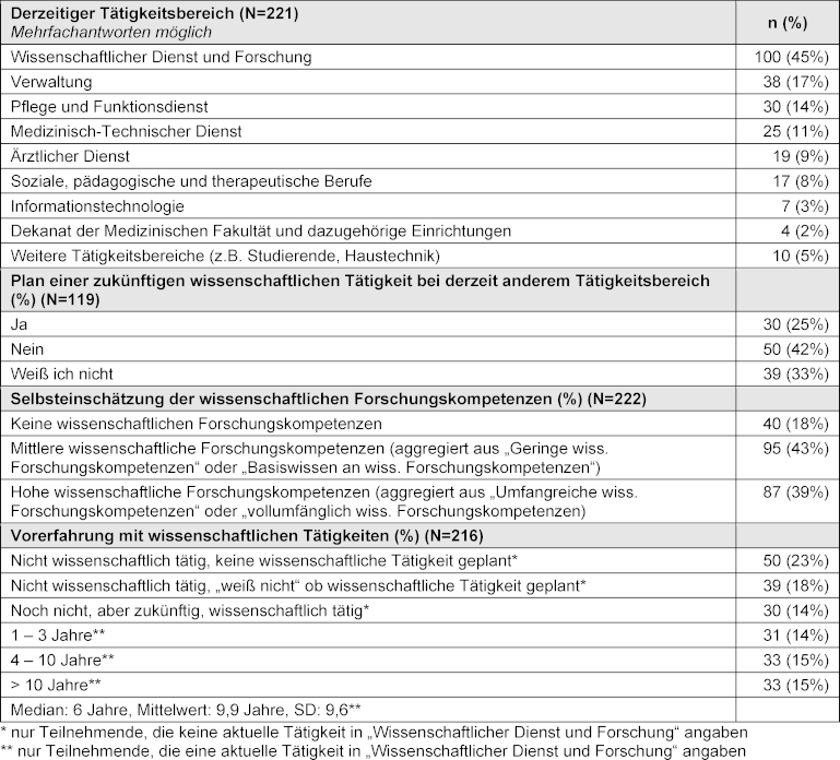 Insgesamt nahmen 222 Personen an der Befragung teil, 137 schlossen die Erhebung ab. 100 (45%) Teilnehmende gaben an, zum Zeitpunkt der Befragung in der Forschung tätig zu sein. 30 Teilnehmende, die zum Zeitpunkt der Befragung ausschließlich außerhalb der Forschung beschäftigt waren, planten zukünftig eine wissenschaftliche Tätigkeit. Hinsichtlich der wissenschaftlichen Vorerfahrung gaben die Befragten eine unterschiedliche Dauer bisheriger wissenschaftlicher Tätigkeiten an (siehe Tabelle 1 [Tab. 1]).