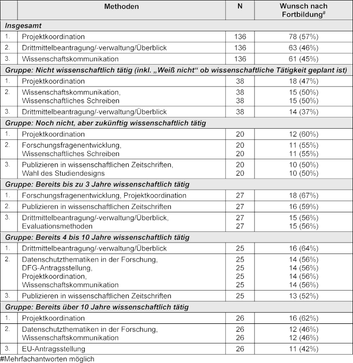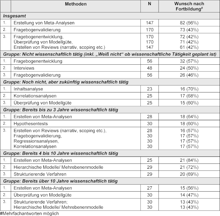 Tabelle 4: Die drei am häufigsten genannten Fortbildungswünsche insgesamt und gruppiert nach wissenschaftlicher Erfahrung der Teilnehmenden