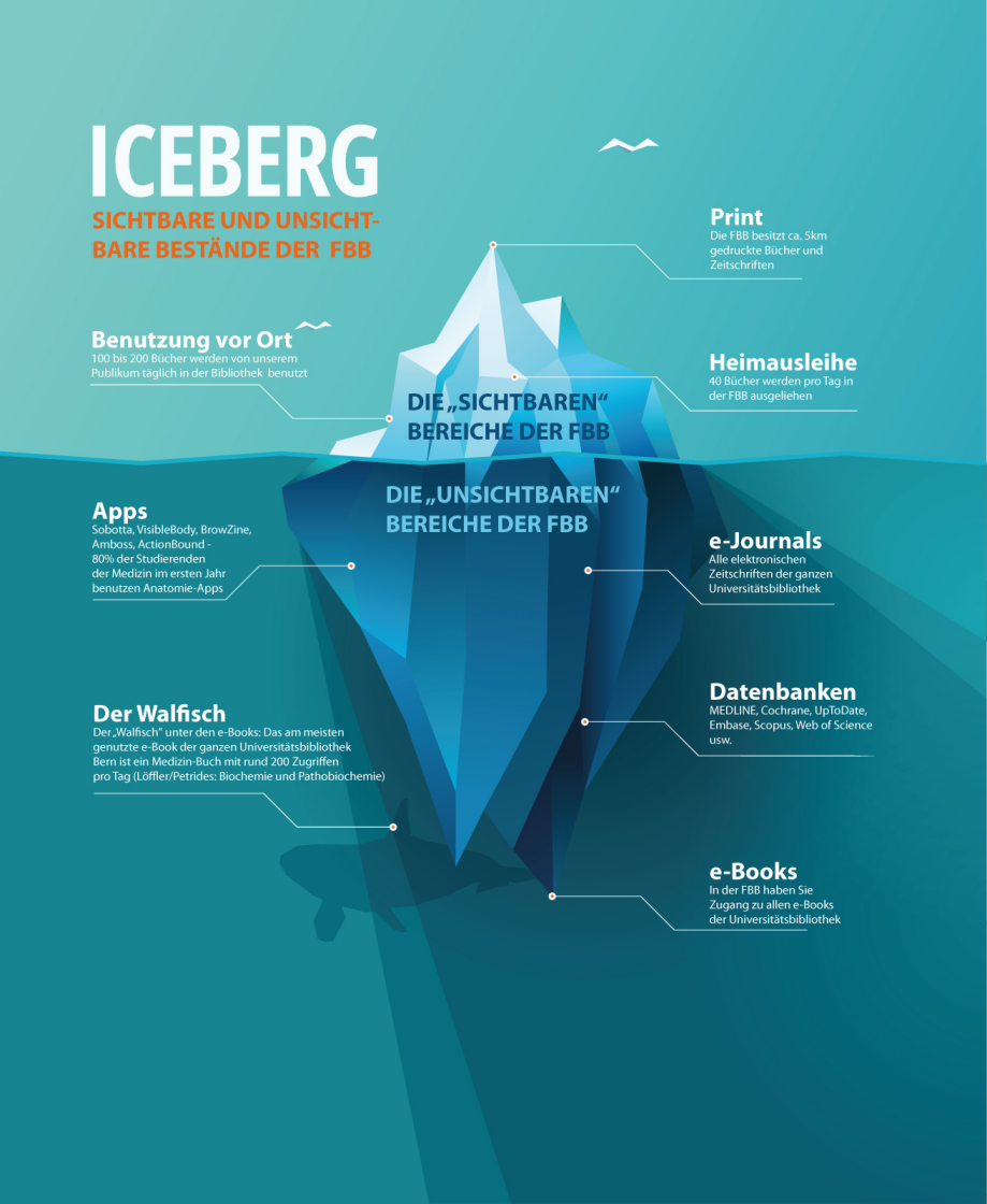 Die FBB verfügt über rund fünf Kilometer an gedruckten Büchern und Zeitschriften. Ein grosser Teil davon ist im Freihandbereich aufgestellt und somit sofort gut sichtbar für alle, welche die Bibliothek betreten. Ganz anders verhält es sich bei den elektronischen Ressourcen, welche gewissermassen die „unsichtbaren Bestände“ darstellen – oder den Teil des Eisberges, der sich unter der Wasseroberfläche befindet (Abbildung 1 [Abb. 1]). Genau diesen Bereich wollten wir unserem Publikum ins Bewusstsein holen. Wir haben uns von der Staatsbibliothek zu Berlin zu unserem e-Day inspirieren lassen – gute Ideen sind ja bekanntlich immer gestohlen.