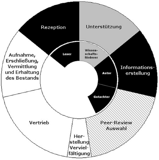 Die traditionelle Publikationskette, so der informationswissenschaftliche Terminus, setzt sich aus sieben Akteuren zusammen: Angefangen beim Wissenschaftsförderer und dem Autor über den Gutachter, den Verlag und den Handel bis hin zur Bibliothek und dem Leser.