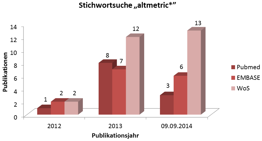 Die Treffermenge von 12 Referenzen in PubMed erscheint extrem gering. Eine Testrecherche nach „social media“ ergab hingegen 2.450 Referenzen. Eine Suche nach „twitter“ ergab 519 Referenzen. Dieses Ergebnis zeigt, dass die Thematik an sich in der medizinischen Community diskutiert wird und die Suche nach „altmetrics“ allein nicht repräsentativ sein kann. Eine Ursache hierfür liegt möglicherweise darin, dass der Begriff Altmetrics bisher eher in der bibliometrischen und szientometrischen Community verbreitet ist. Dies näher zu untersuchen, war jedoch nicht Gegenstand dieser Arbeit.