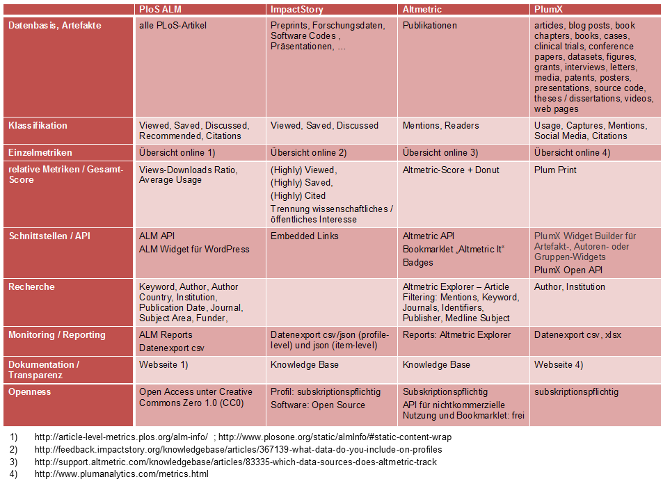 Gemeinsam ist den untersuchten Altmetrics-Diensten ein vielfältiges Angebot an Metriken. Jedoch zeigen sich grundlegende Unterschiede in mehrfacher Hinsicht. Dazu gehören das analysierte Datenmaterial (Artefakte), die Auswahl von Einzelmetriken, Bewertungsverfahren, Schnittstellen, Reporting-Optionen und das jeweilige Geschäftsmodell. So ist PLoS ALMs als einziges Tool gänzlich frei zugänglich. Es lässt sich aber nur auf die Artikel des eigenen Verlages anwenden. Hingegen stellen die anderen drei Tools verlagsunabhängig Kennzahlen für unterschiedliche Publikationsformen (ImpactStory und Plum Analytics) oder für klassische Publikationen (Altmetric) bereit, sind aber kostenpflichtig. Differenzen bestehen in der Definition der Kategorien und der Auswahl und Zuordnung von Einzelmetriken. Wie in Tabelle 1 [Tab. 1] ersichtlich, werden zum Beispiel teilweise Views und Downloads getrennt kategorisiert (PLoS, ImpactStory), im Fall PlumX jedoch als Einzelmetriken in einer Kategorie zusammengefasst. Bei der Wichtung relativer Metriken werden unterschiedliche Konzepte verfolgt. Daher dürfen diese Kennzahlen nur innerhalb eines Systems verglichen werden. Wird zusätzlich ein Gesamtscore angegeben (Altmetric), suggeriert diese Tatsache dem Anwender die Möglichkeit einer leicht handhabbaren Wirkungsmessung. Tatsächlich jedoch wird aus einer einzigen Zahl nicht erkennbar, welche Kommunikationswege in welchem Maße genutzt wurden. Bewertungsverfahren sind in einer Knowledge Base oder auf einzelnen Webseiten dokumentiert, teilweise aber nur schwer auffindbar. Während PLoS ALMs sich an Wissenschaftler, Institutionen, Förderer und Verlage und somit an alle potentiellen Interessenten richtet, sieht Altmetric seine Nutzer in der Reihenfolge Verlage, Institutionen und Wissenschaftler. ImpactStory spricht bisher speziell die Wissenschaftler an, arbeitet jedoch an einem Angebot für Institutionen. PlumX ist speziell für die Analyse des institutionellen Forschungs-Outputs konzipiert.