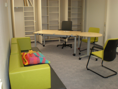 Denn nirgendwo sonst gibt es die Möglichkeit, während der gesamten Öffnungszeiten unter der Woche und am Wochenende in direkter Gemeinschaft mit den Kindern zu lernen und zu arbeiten, ohne sie zu festen Uhrzeiten irgendwo „abgeben“ zu müssen. Entweder man nutzt das buchbare Büro mit PC, Konferenztisch und Ruhemöglichkeit (Abbildung 3 [Abb. 3]) oder den offenen Aufenthaltsbereich mit Spielzeug, Büchern, Sofa und Besprechungstischen (Abbildung 4 [Abb. 4]).