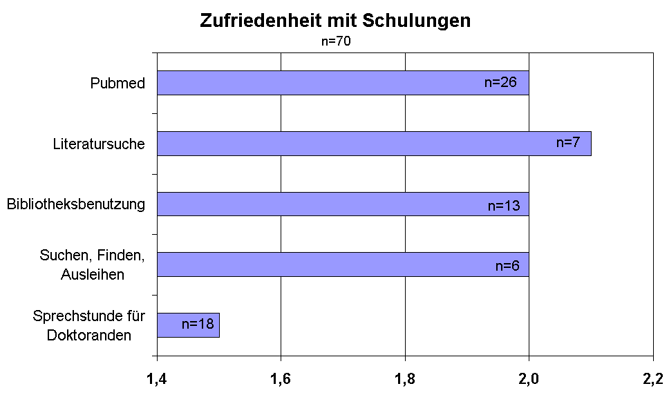 Die zweite Schulung, die Literatur- und Informationssuche im Internet (http://www.uni-muenster.de/ZBMed/benutzung/schulungen/effektiv.html Literatur- und Infosuche im Internet), weist die Besonderheit auf, dass sie in Zusammenarbeit mit der Stabsstelle Medizinische Informationsverarbeitung bzw. dem Institut für Medizinische Informatik und Biomathematik ausgerichtet wird. Während für alle anderen Schulungen die Anwerbung und Organisation alleine in den Händen der Bibliothek liegt, findet dies in diesem speziellen Fall extern statt - wie auch die Schulungen selber. Zudem besteht die Klientel nicht aus Studenten sondern größtenteils aus UKM-Bediensteten wie z.B. Pflegekräften und Ärzten. Sieben Antwortende gaben an, diese Fortbildungsveranstaltung besucht zu haben, ihre Zufriedenheit betrug durchschnittlich 2,1.