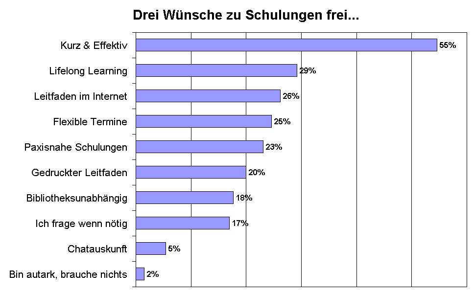 Lediglich die Chat-Schulungen und die „Autarkievariante“ wurden mit 5% resp. 2% deutlich abgelehnt. Den ostentativ autarken Nutzer scheint es also wohl nur in der Wahrnehmung der Bibliothekare zu geben, aber nicht (oder zumindest sehr selten) in der Realität.
