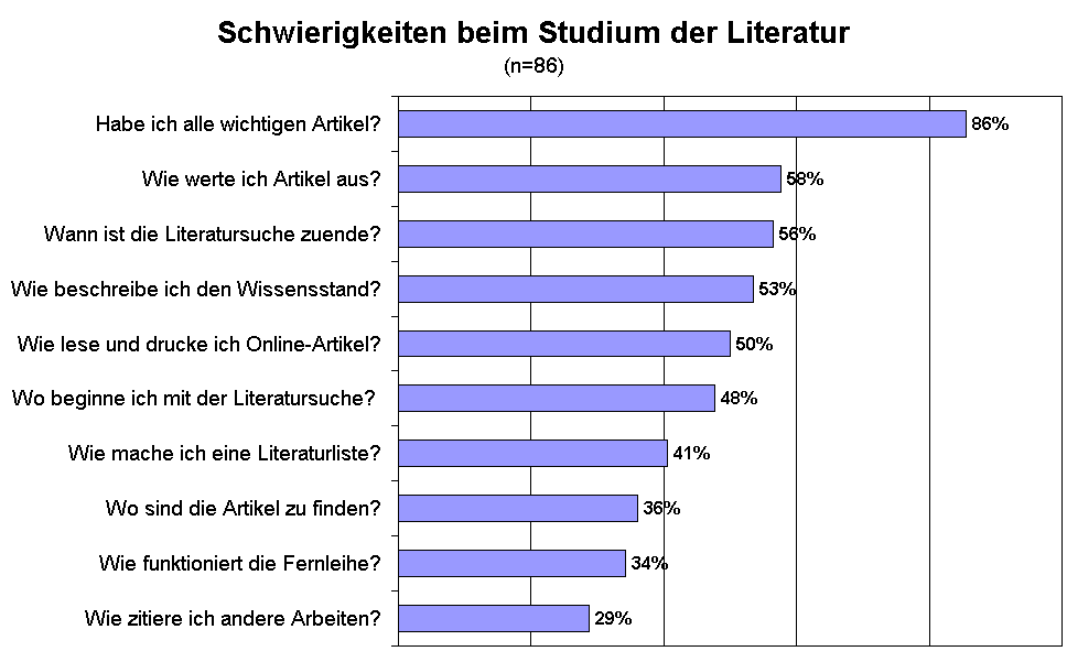 Obwohl nur nach der Meinung von Doktoranden gefragt wurde, beantworteten 86 Personen diese Frage. Für die überwältigende Mehrheit (86%) war das dringendste Problem, nicht zu wissen, ob man alle wichtigen Artikel gefunden hatte (Abbildung 6 [Abb. 6]). Die nächste Schwierigkeit bestand im Lesen und Verstehen der gefundenen Veröffentlichungen (58%), dicht gefolgt von der Frage, wann man mit der Literatursuche aufhören darf (56%) und wie man den gegenwärtigen Stand des medizinischen Wissens zusammenfasst (53%). Die Hälfte der Antwortenden wusste nicht, wie Online-Paper zu lesen und auszudrucken sind, 48% quälte die Frage, wo sie genau mit der Literatursuche anfangen sollten, und 41%, wie sie eine Literaturliste erstellen sollten (41%). Das Auffinden der Zitate im Internet und in der Bibliothek (35%), die Benutzung der Fernleihe (33%) sowie die Zitierung (28%) war für 1/3 der Antwortenden problematisch.
