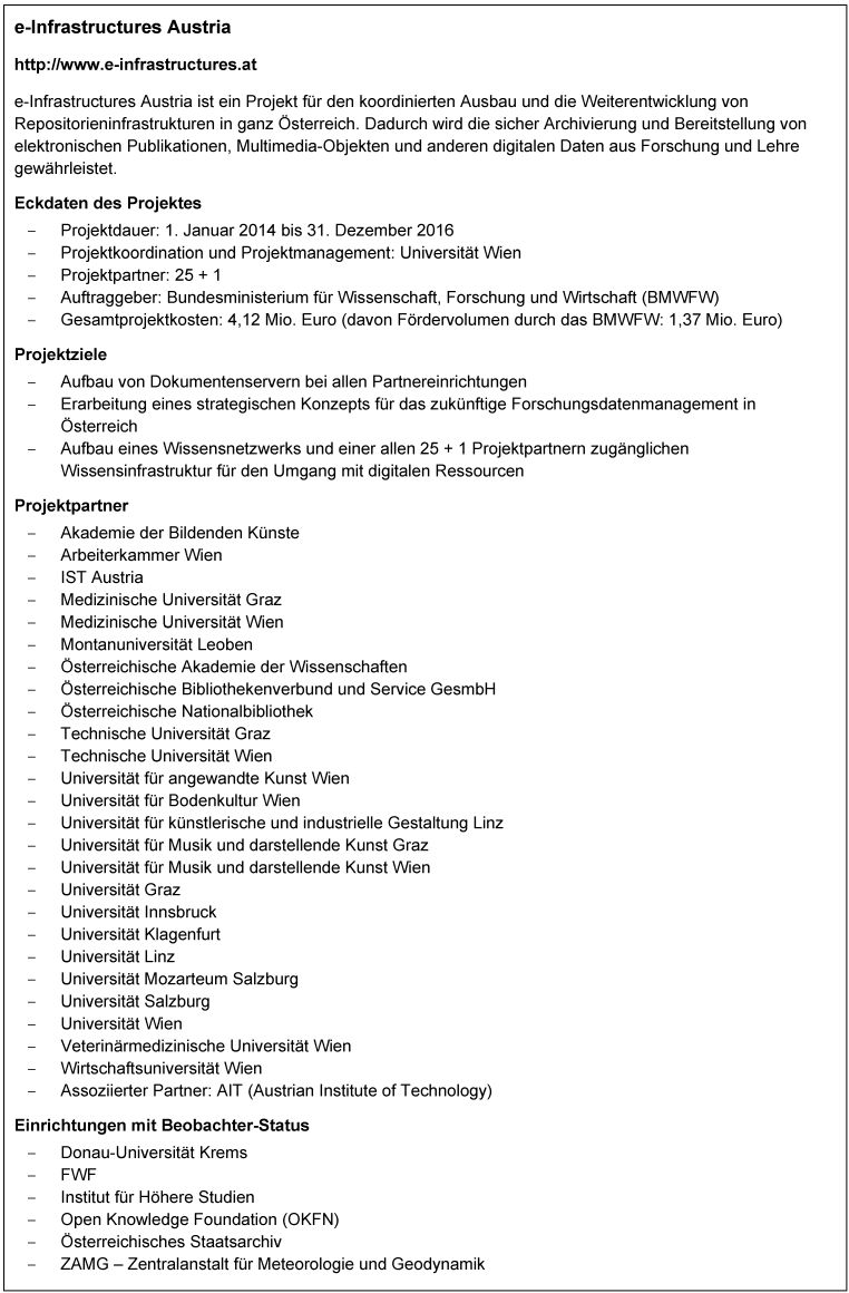 [25] Bauer B, Budroni P, Ferus A, Ganguly R, Ramminger E, Sánchez Solís B. e-Infrastructures Austria 2014: Bericht über das erste Jahr des Hochschulraumstrukturmittelprojekts. Mitteilungen der Vereinigung Österreichischer Bibliothekarinnen und Bibliothekare. 2015;68(1):91-118. Verfügbar unter: http://eprints.rclis.org/25467/