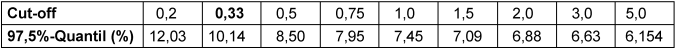 Mit fallendem Wert der Relation der Stichprobengrößen ist mit einem zu häufig deutlich erhöhten empirischen Fehler 1. Art zu rechnen, sodass die EWR dann nicht mehr angewendet werden sollte. Es kann ein Cut off so bestimmt werden, dass folgendes gilt: Beschränkt man die Anwendung der EWR auf Szenarien, in denen die Relation der Stichprobengrößen größer gleich dem Cut-off ist, so haben weniger als 2,5% der Szenarien einen empirischen Fehler 1. Art von über 10%. Aus Tabelle 2 [Tab. 2] kann für verschiedene Cut-offs entnommen werden, wie hoch der empirische Fehler 1. Art für die 2,5% mit dem größten empirischen Fehler 1. Art mindestens ist (97,5%-Quantile der Verteilung der simulierten Fehler 1. Art der Szenarien). Beschränkt man die Anwendung der EWR auf Szenarien, in denen die Relation der Stichprobengrößen ≥0,33 ist, so haben weniger als 2,5% der Szenarien einen empirischen Fehler 1. Art von über 10%. Bei einem Cut-off von 0,2 hätten mehr als 2,5% der Szenarien einen empirischen Fehler 1. Art von über 10%. Hieraus ergibt sich die Testprozedur EWR0,33: zusätzlich zu den unter den Schritten 1 bis 4 genannten Bedingungen wird 0,33 als Cut-off für die Relation der Stichprobengrößen