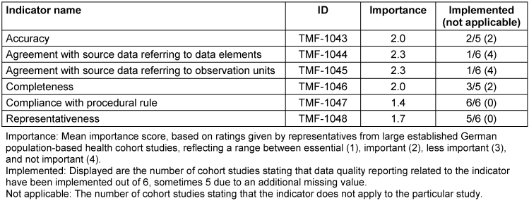 In this work, the applicability, importance and implementation of the TMF data quality indicators was assessed by representatives from established German population-based epidemiologic cohort studies. Based on this assessment, we aimed to provide guidance on indicators considered to be of high relevance and on how to further improve the guideline. Secondary data collections with their specific demands, including the integration of data from secondary sources within the participating cohort studies, were not in focus.